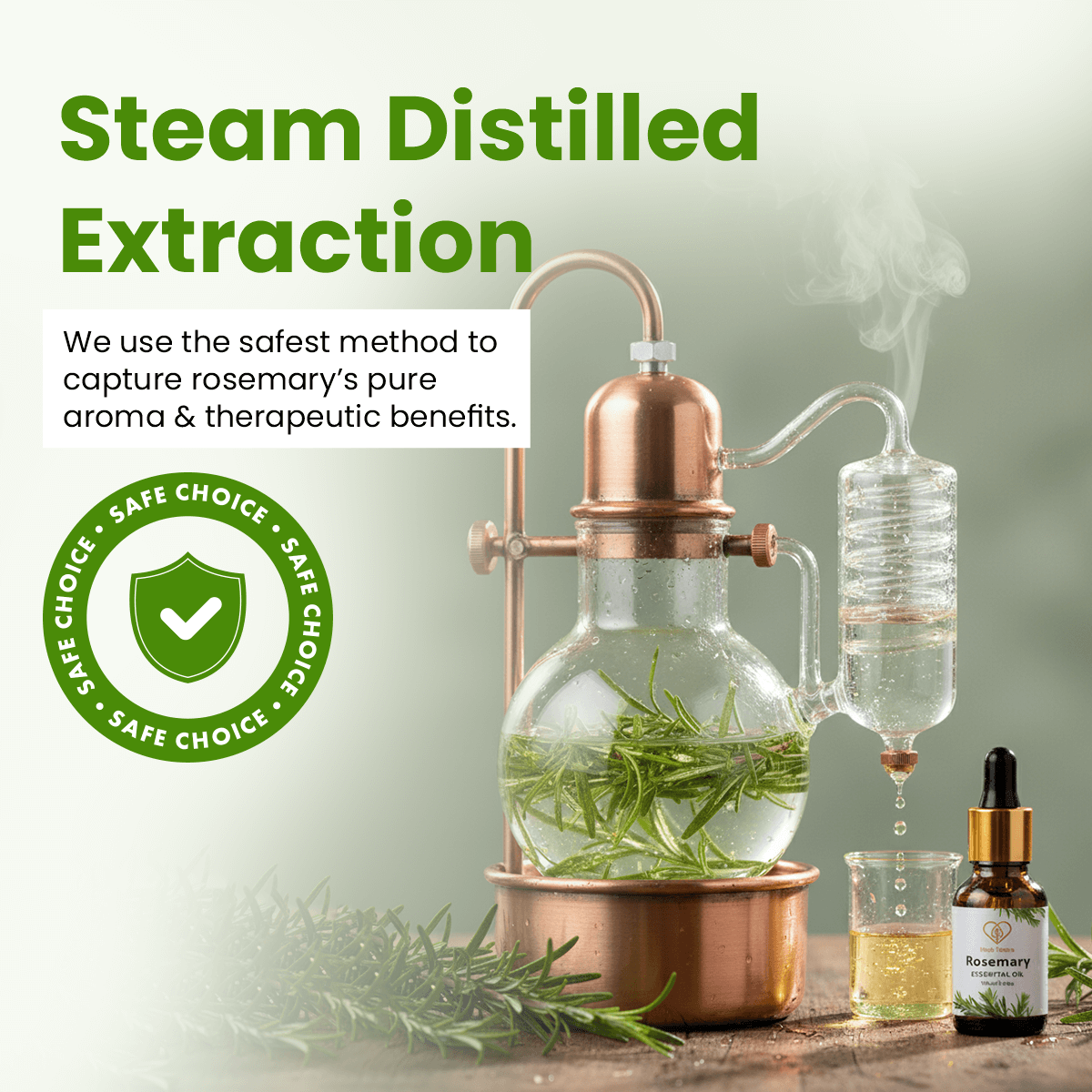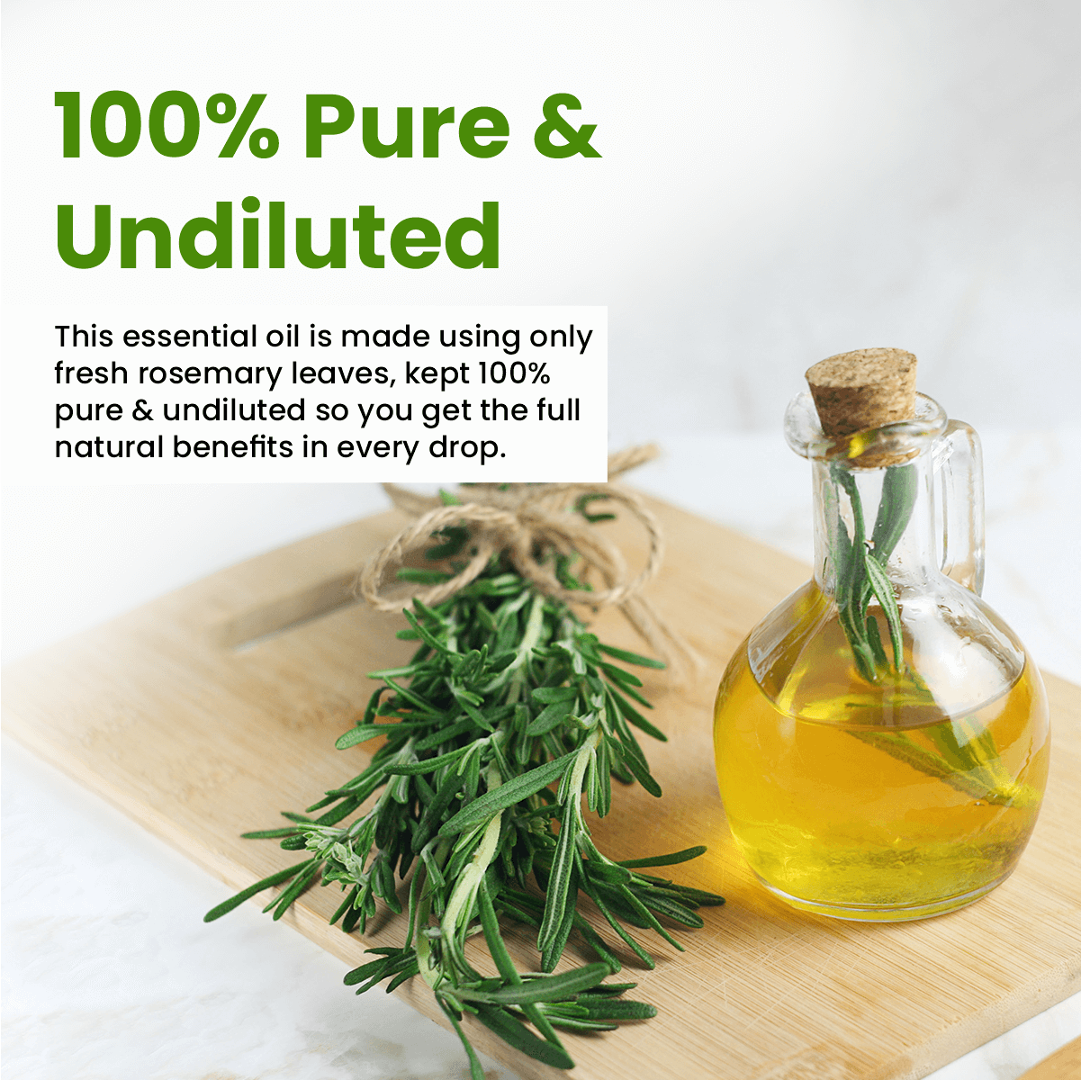 - 100% pure and undiluted rosemary essential oil, steam-distilled from fresh leaves. Sourced at the origin for maximum purity. Supports scalp circulation, improves hair growth, reduces dandruff and reduces hair fall when diluted with a carrier oil.